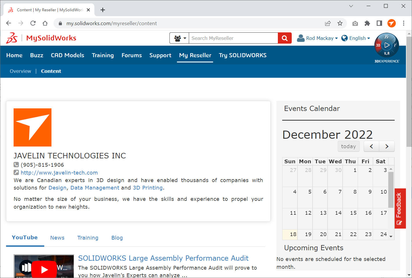 Access to My VAR provides you with Javelin content feeds for SOLIDWORKS blogs, videos, news, and a schedule of upcoming events. Included Included